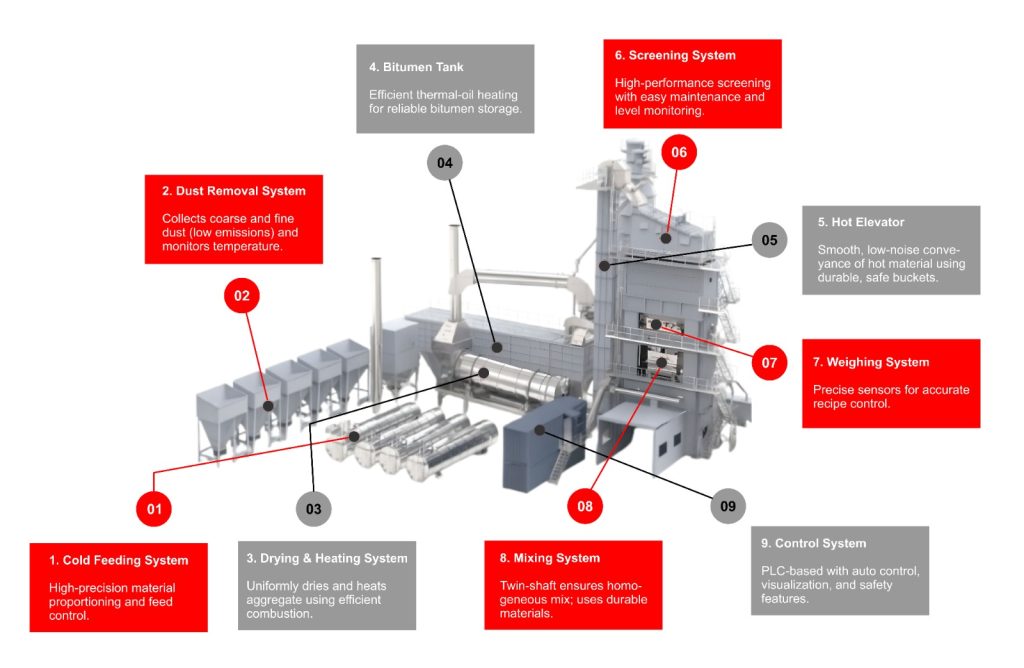 It combines intelligent automation with precision batching and eco-friendly dust control to deliver top-quality asphalt at reduced operating cost.